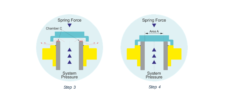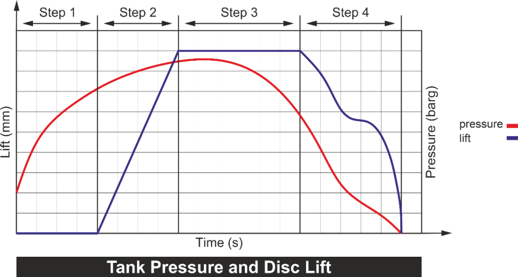 - Once the accumulated pressure exceeds the spring force, the disc lifts and the valve pops open